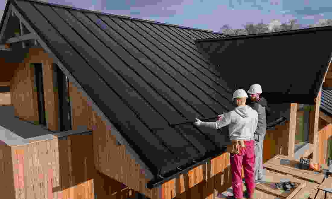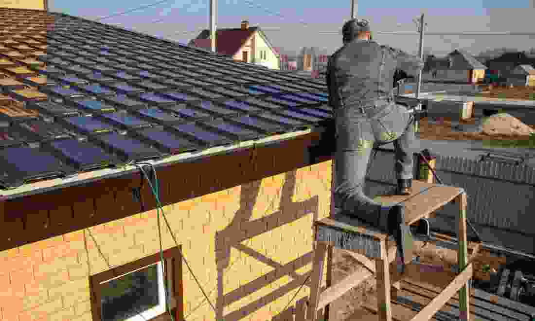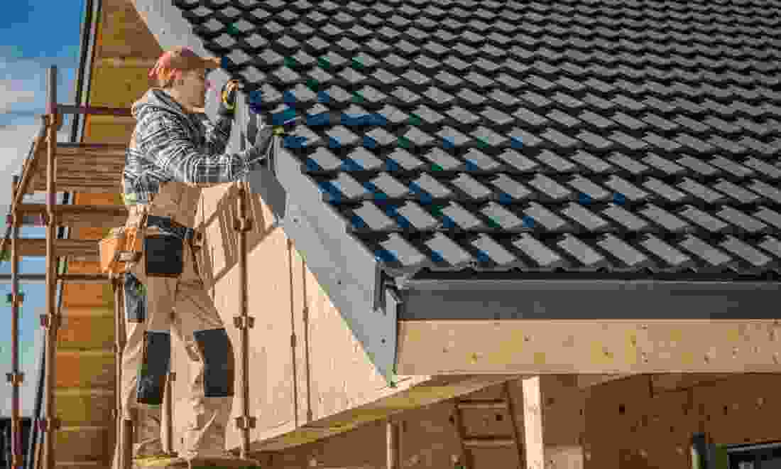 Lay shingles, tiles, or metal panels securely, starting the work.